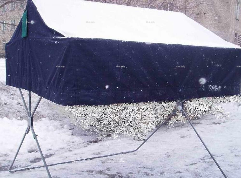 Установка палатки «Вахтовик» в рабочее положение занимает 2 минуты. Требуется развернуть палатку и закрепить ее в рабочем положении. Возможен обогрев внутреннего пространства палатки – достаточно тепловой пушки 3 КВТ.